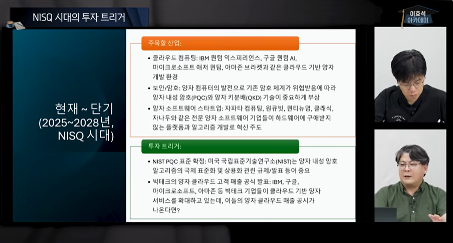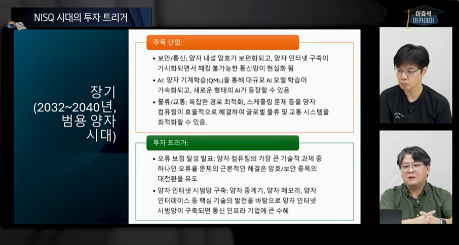| 단기 (~3년) | NISQ 시기, 불완전한 단계 | 클라우드 플랫폼 & 보안 인프라 | IBM, MS, Google, Amazon, SKT 등 |