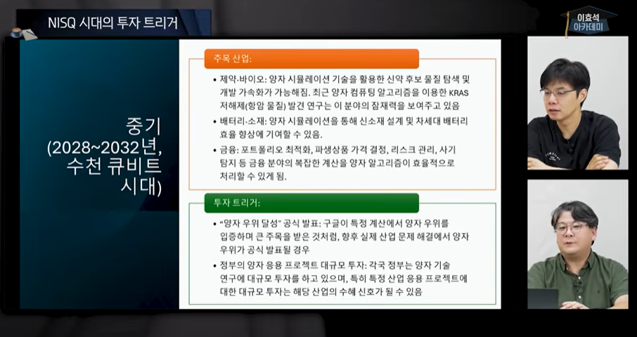 | 중기 (3~10년) | 수천 큐비트 시도 & 실용화 | 신약·소재·핀테크 분야 실사용 확대 | 바이오·소재·금융 스타트업 |